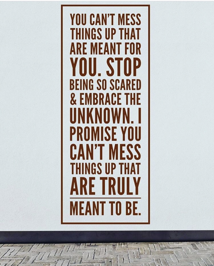 I start to panic about things and then this quote plays in my head reminding me that my only job is to do the best that I can in all that I do and if it’s meant for me, nothing will sabotage it. It reminds me that if things go awry it’s temporary and eventually the water will level out and I will no longer be drowning in whatever is happening. I will eventually float on my back and coast back to where I’m supposed to be or where I’m supposed to be headed. If you really think about those words “You can’t mess something up that is meant for you” it takes the pressure off of trying to manipulate your outcomes. It should take the edge off of worrying about the unknown. If I think of the jobs I didn’t get or the relationships that didn’t work out I realize how much better off I am that it didn’t. I find comfort now in these words because I realize that no matter what, I’m going to be ok. So why worry about outcomes that aren’t up to me? Just do the best that you can and leave the rest up to fate.